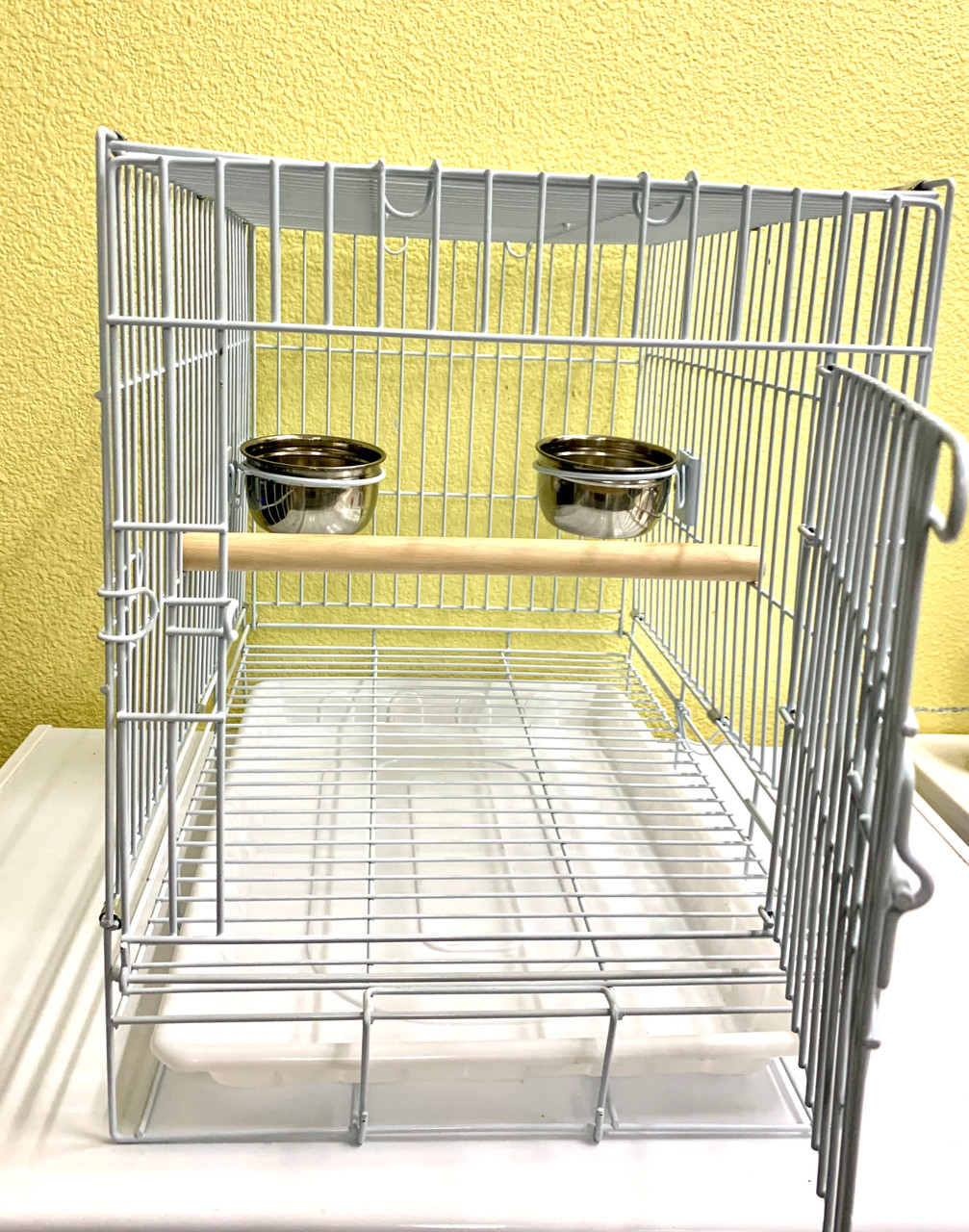Fold-able carrier cage for birds and small animals. Only available in white.