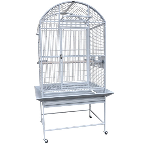 HQ or King Cages, dome top comes with 2 perches and 5 stainless steel feeder bowls .Also, it comes with metal skirt/mess catcher and in different colors; brass/sand, green, copper, light grey, and silver-tone.